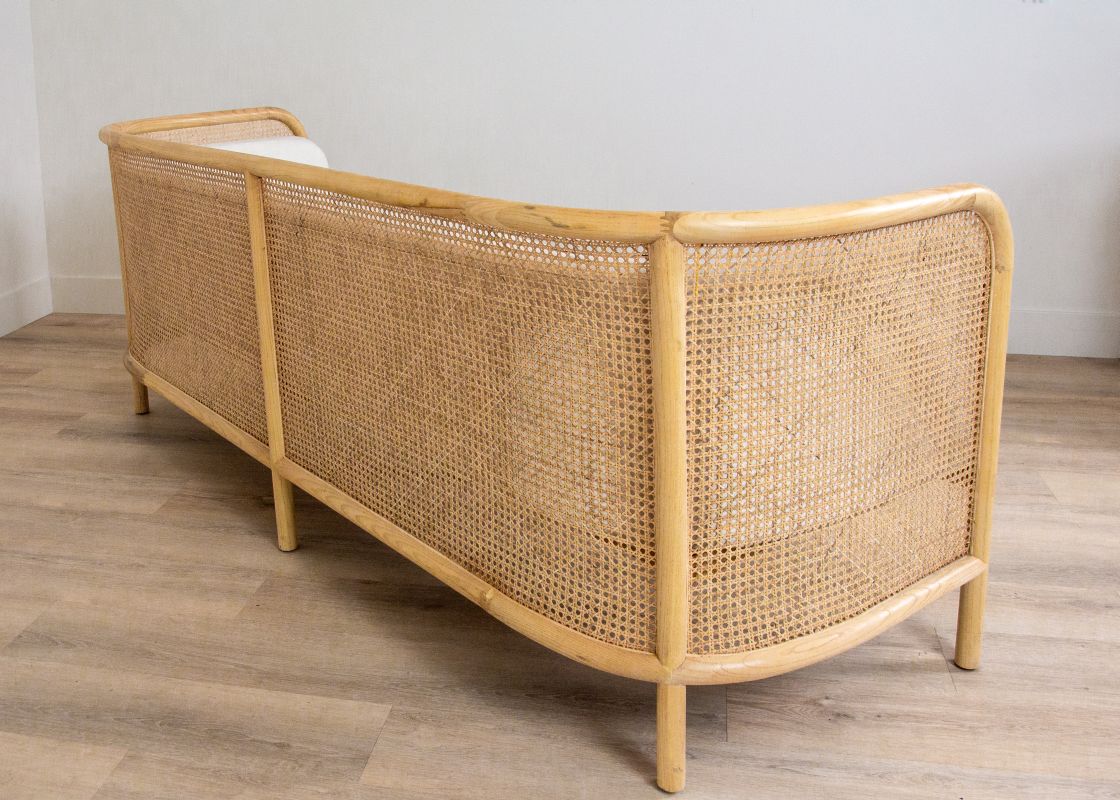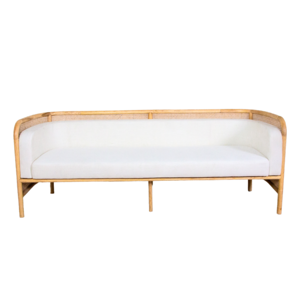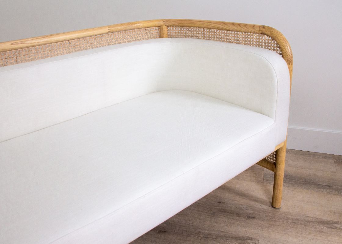 With boho cane backing, this white-cushioned lounge sofa is a relaxing and effortless aesthetic for any type of event.
